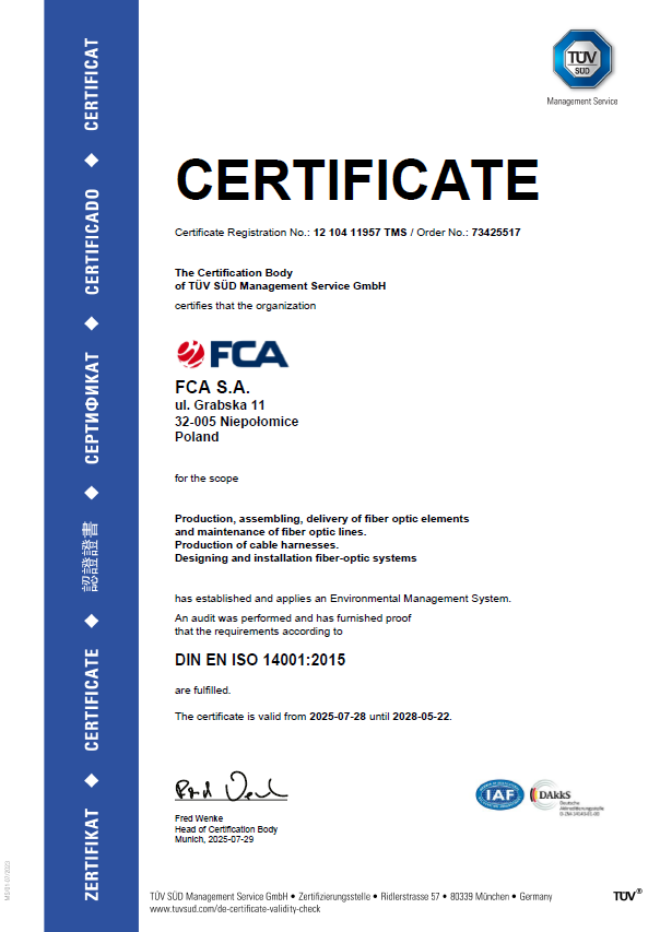 The ISO 14001 certificate is an official confirmation of our compliance with the international standard for environmental management. It confirms that we care for the environment in the course of our technological processes. We do our utmost to save energy, use raw materials rationally, generate as little waste as possible, and recycle secondary raw materials. We continuously optimize all processes to best protect the environment. Our clients can be confident that by choosing FCA, they are contributing to environmental-protection and resource-conservation efforts.