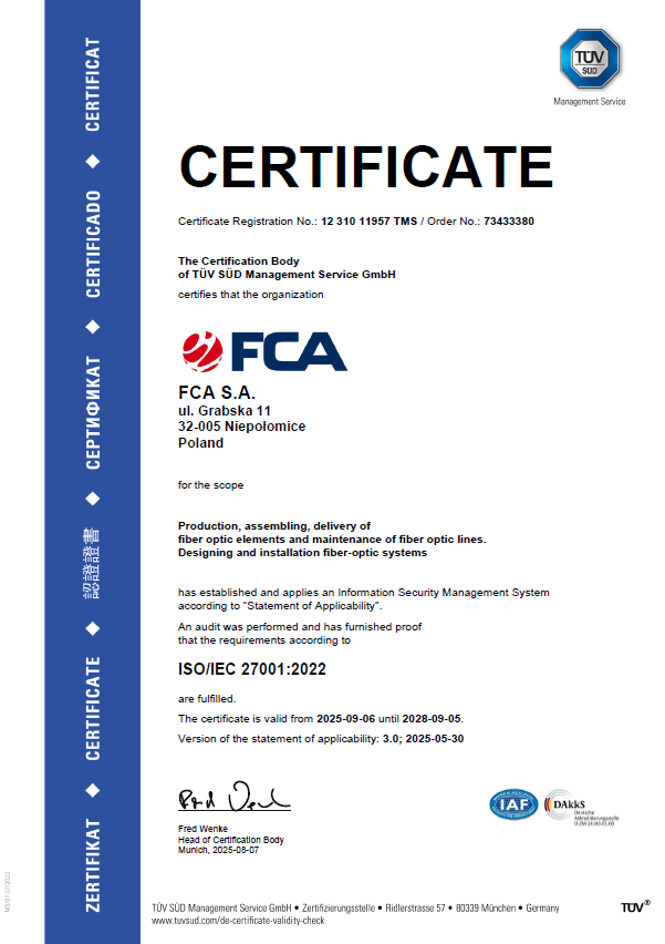 At FCA, we comply with the highest management system standards. This is confirmed by certificates of compliance with international standards: ISO 9001, ISO 14001, and ISO 27001.
